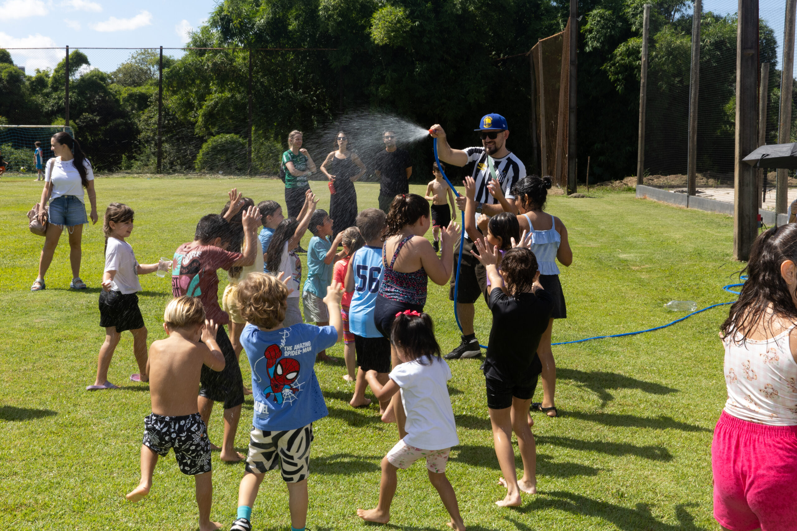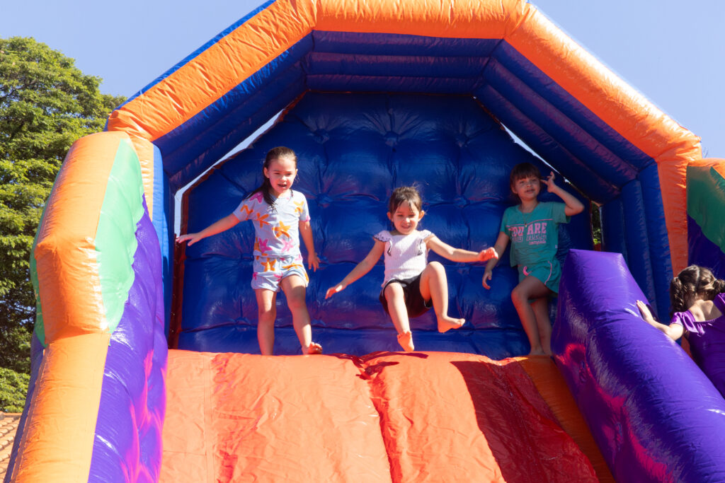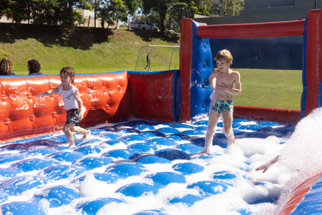 Um momento planejado com muito carinho para as crianças. Brinquedos infláveis com o pula-pula, o giro radical, o tobogã e o disputado futebol de sabão que diverte e forma uma fila grande porque todos querem brincar. Artur e Luca confirmam que o futsabão é o sucesso entre os alunos do 2 ano do Ensino Fundamental. Com o calor intenso, Maria Júlia, do 3º ano do Ensino Fundamental, aprovou o banho de mangueira e fala que é muito bom curtir com a família. Já Alice, também do 3º ano do Ensino Fundamental, gostou de todos os brinquedos.
