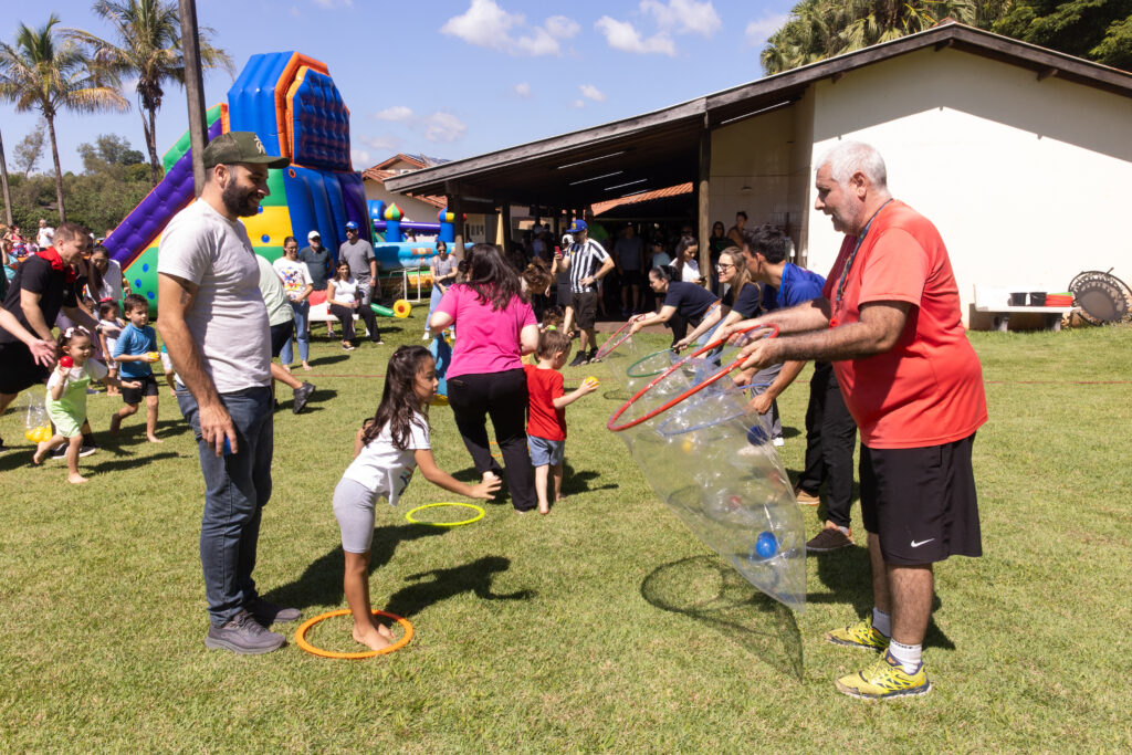 E os pais e família? Estão brincando juntos! Seja no futebol ou na cama elástica a empolgação é contagiante. A gincana animada pelos professores deixou todo mundo esperto na brincadeira. Aqui a criança não brinca sozinha! E todos saem ganhando, pois, as brincadeiras relembram a infância dos pais e dos avós, como brincadeira do saco, a alegria do banho de mangueira e a simplicidade dos castelos de areia. Brincadeiras saudáveis e divertidas que unem ainda mais a família. “Só de ver aqui os avós e tios, dá para ver que a carinha dela que está maravilhosa” fala Igor Sartori, pai de aluno, em relação a felicidade da filha no dia da família. E não é somente isso, os pais podem se reunir, se conectar e formar vínculos. “Às vezes no dia a dia da escola acaba sendo muito corrido e a gente acaba não conhecendo os pais dos amigos dos nossos filhos, e esses momentos são muito importantes para fazer essa conexão”, comenta Igor. E tem pais que dão aquela ajudinha a quem estava na dúvida se participava ou não. “Para mim é maravilhoso. Eu forcei todo mundo a vir, não tem escapatória, porque é pela neta, pela sobrinha e família é tudo” brinca Gabriela Mrtbi Kieski, mãe de aluno.